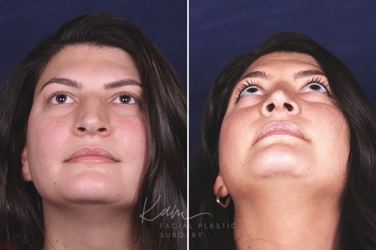 Patient in her 20s bothered by a dorsal hump and droopy nasal tip, seen about 6 months after rhinoplasty.